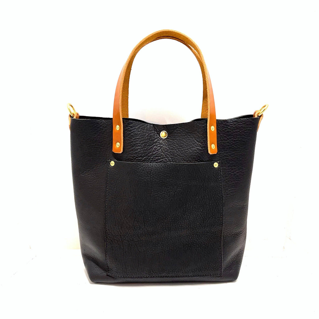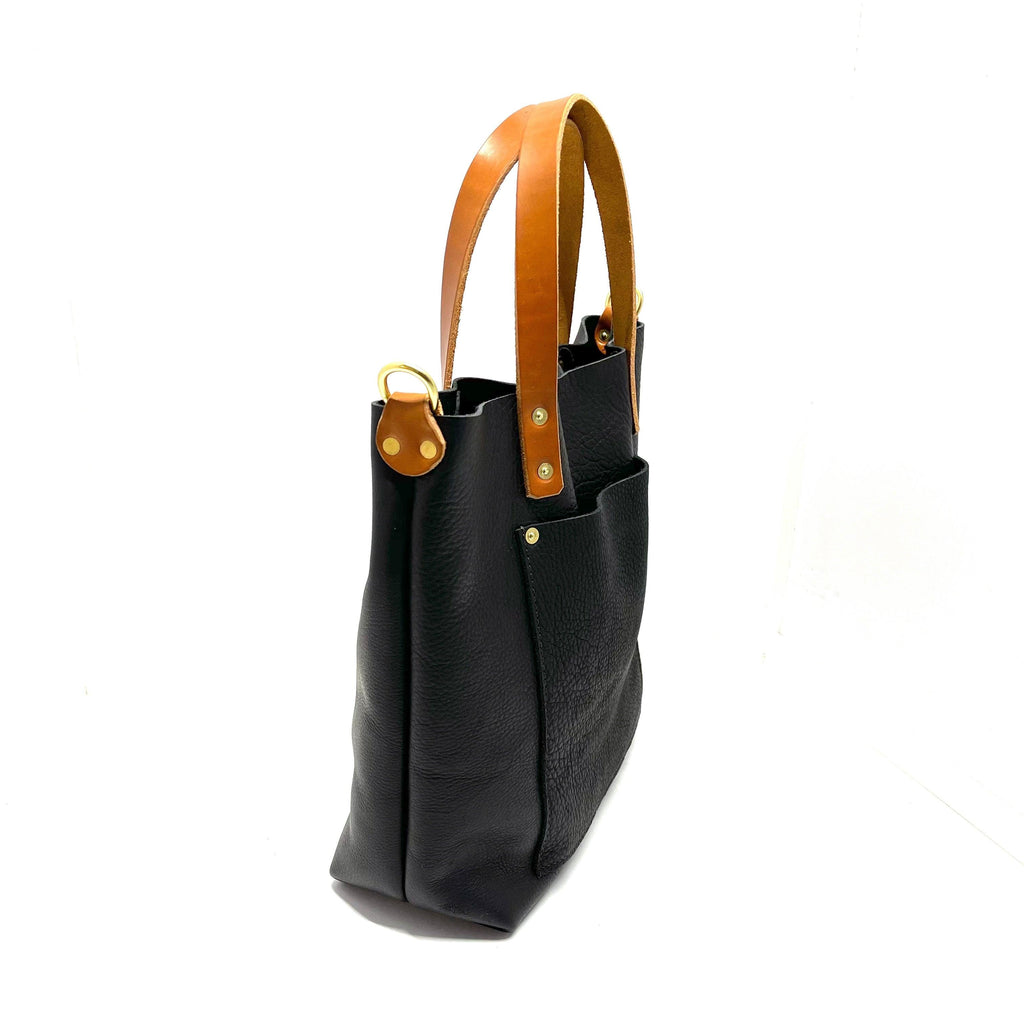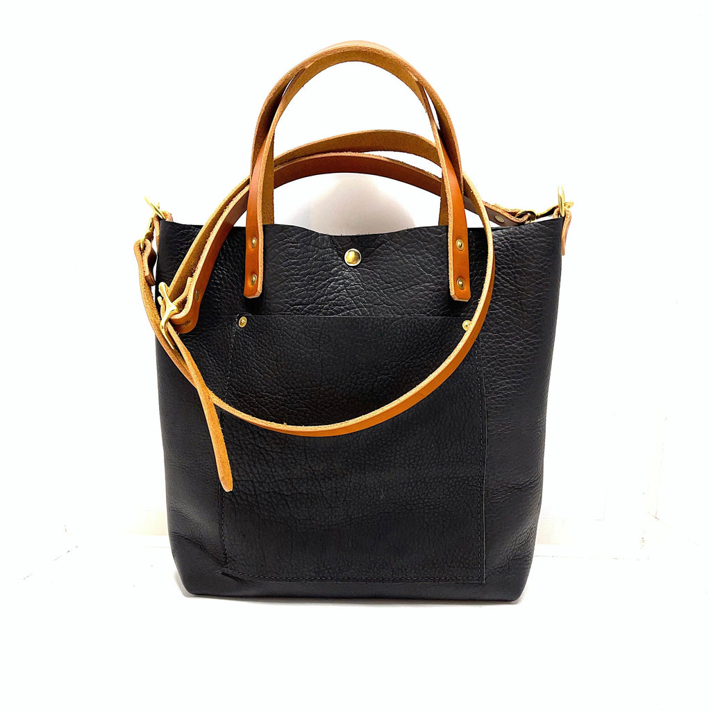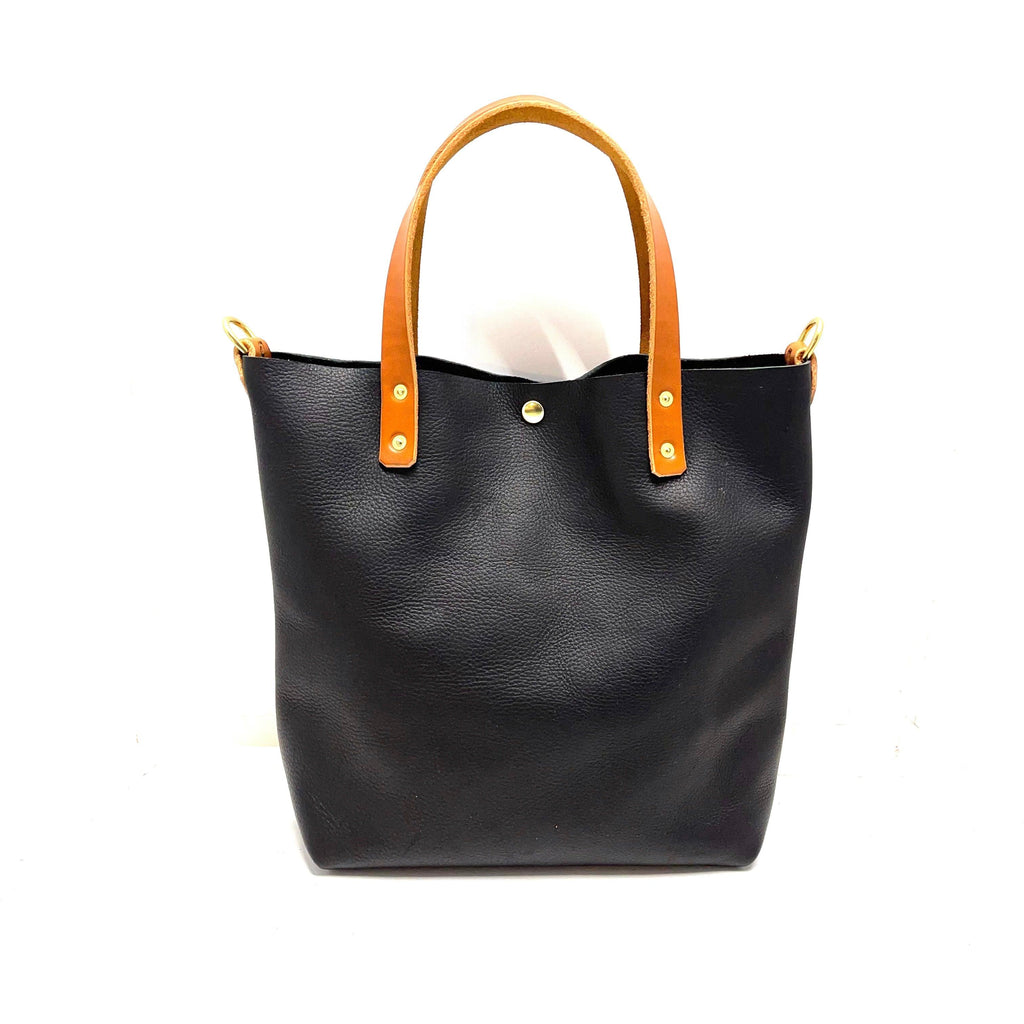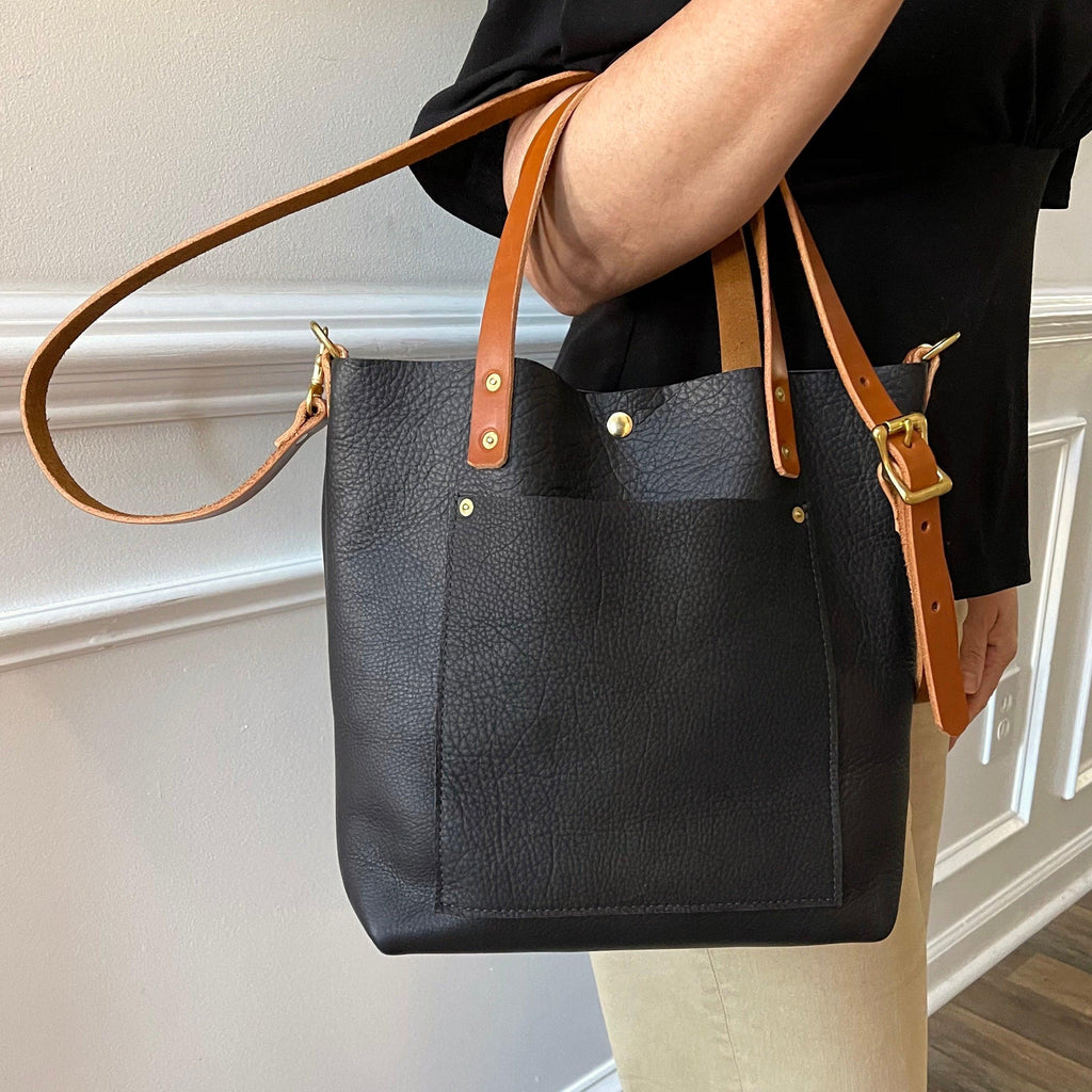 - Sleek and Functional Design: The Black Crossbody Leather Tote features a seamless interior, created by sewing the leather on the inside of the bag. It includes both an exterior and interior pocket for easy organization, while the dark veg-tanned handle and adjustable, removable crossbody strap offer versatile carrying options.