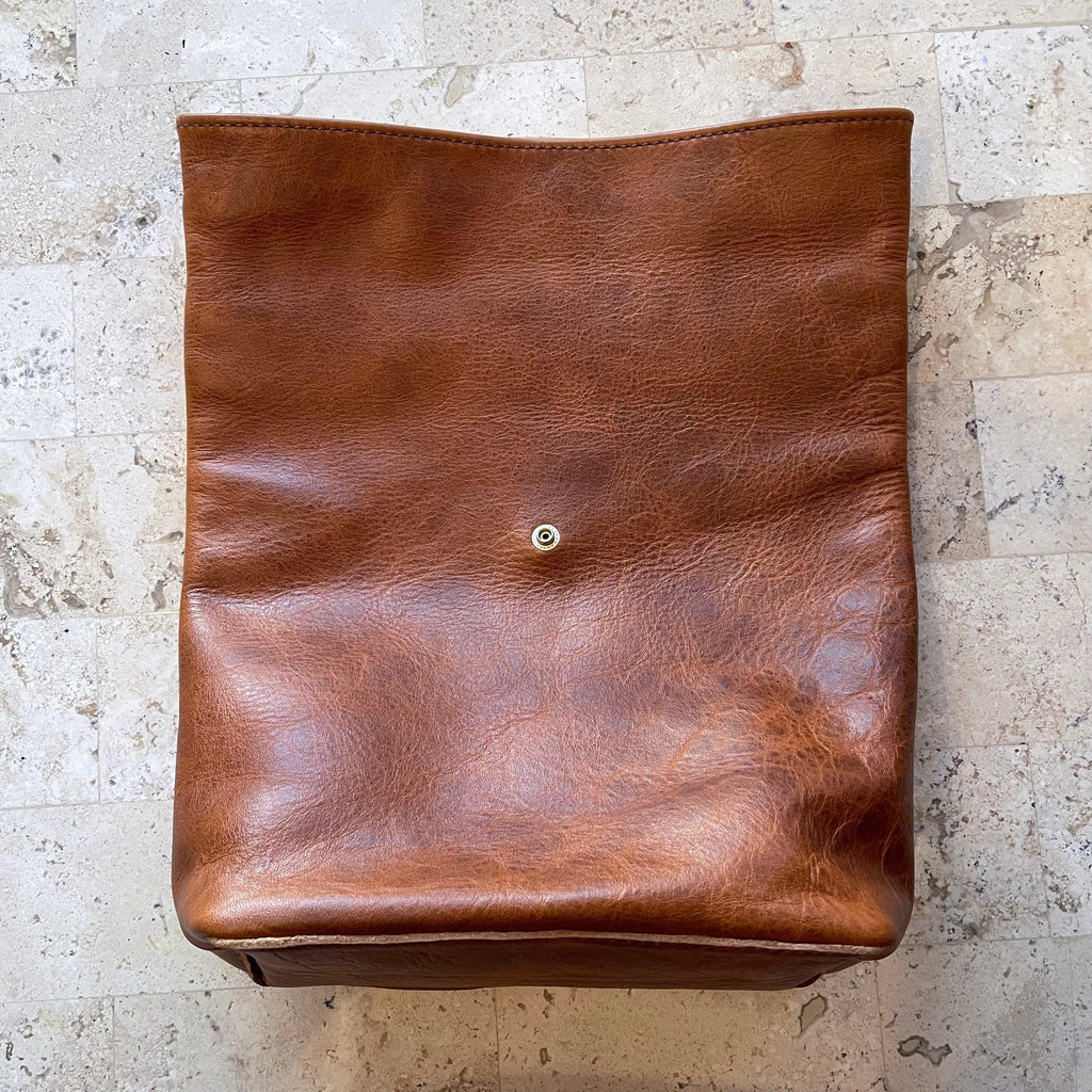 - Materials: Full-grain umber vegetable-tanned leather, secure snap fastener