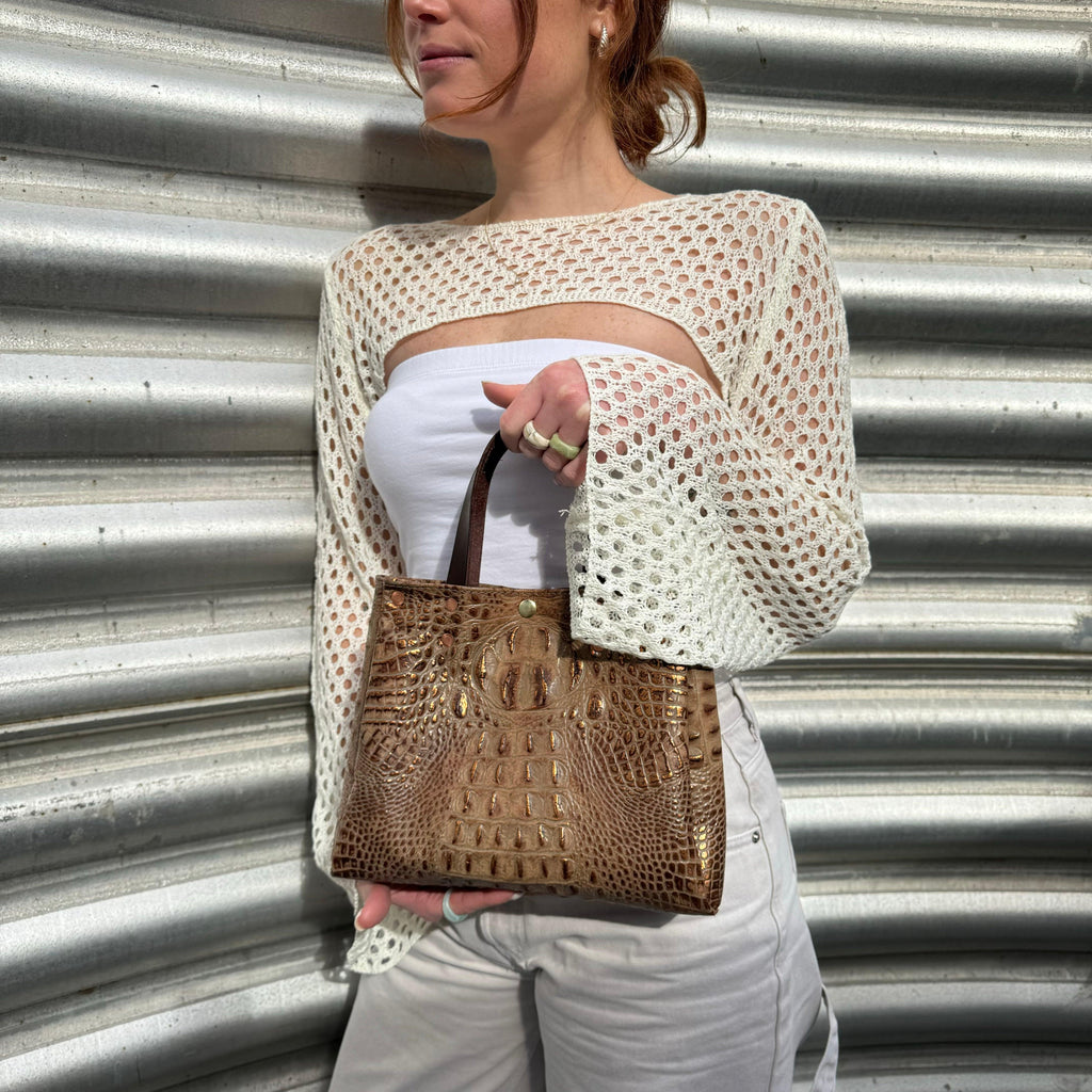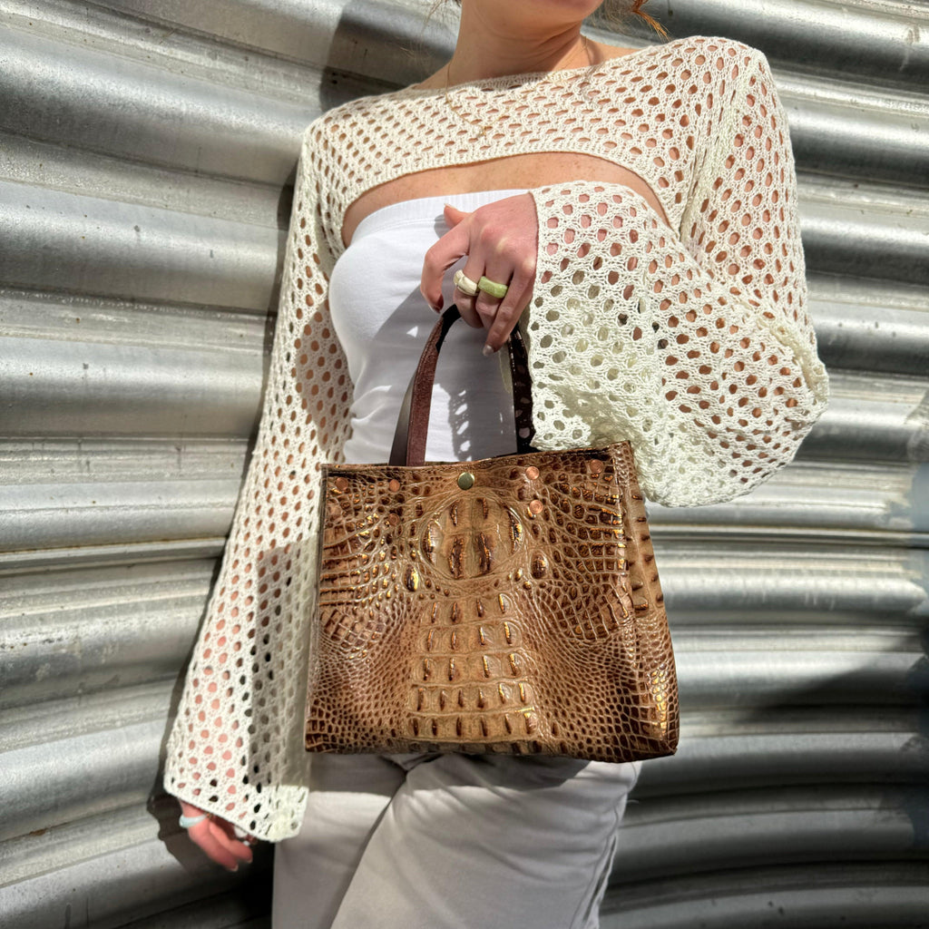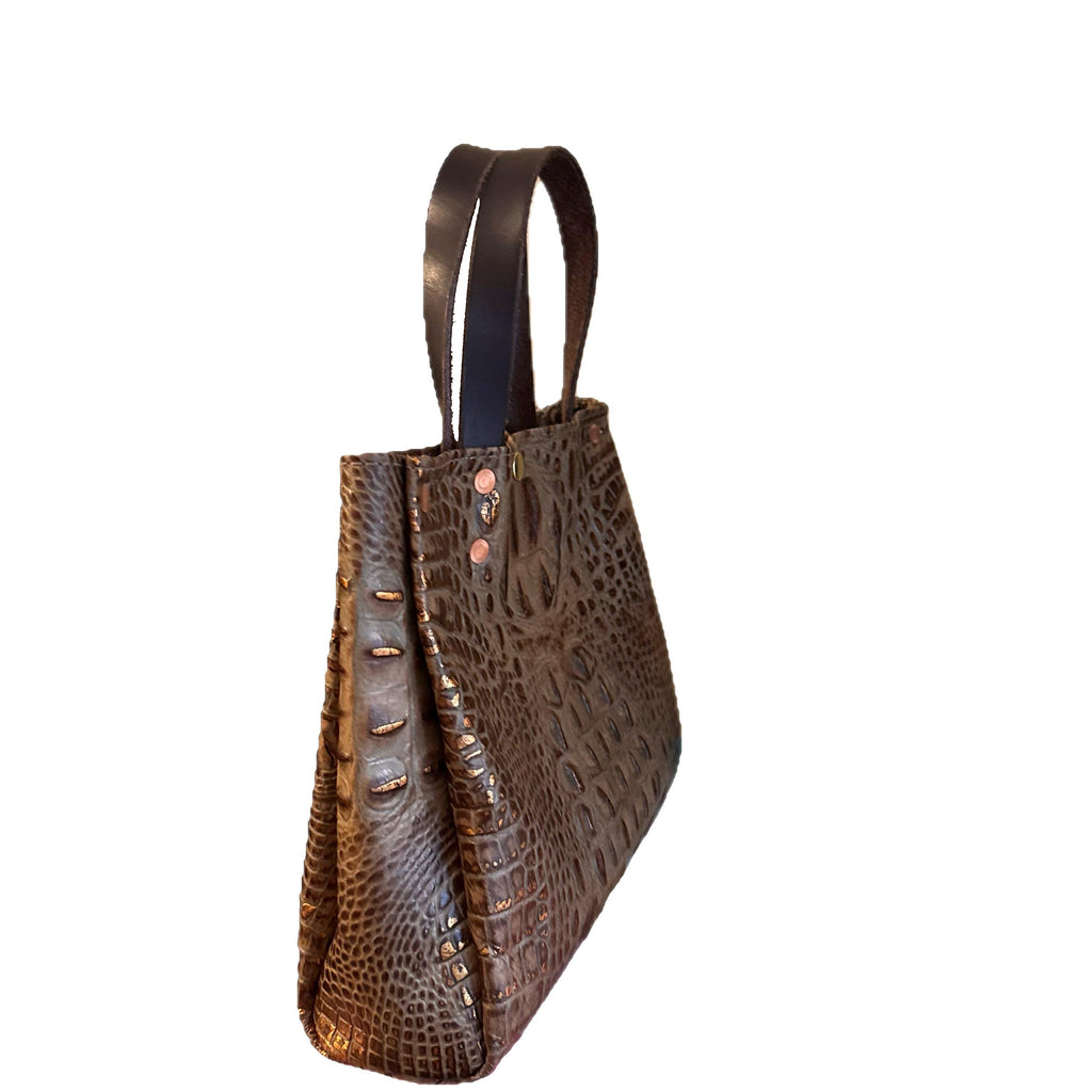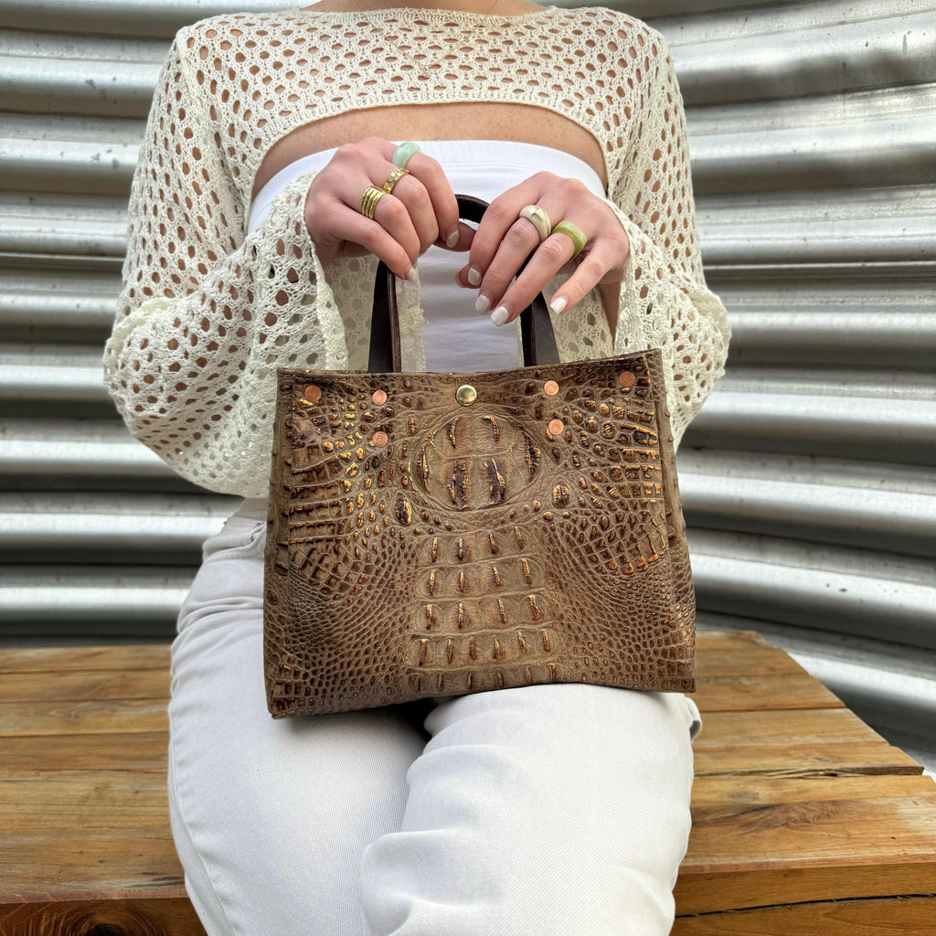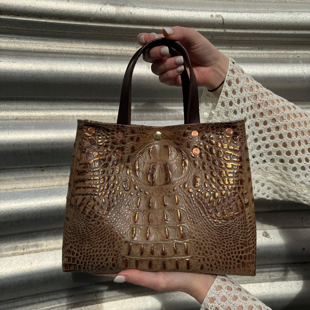 • Premium Materials: Made from the finest, softest croc-embossed full-grain leather, The Ava exudes luxury. The handle straps, crafted from rich, dark brown vegetable-tanned leather, add durability and style.
