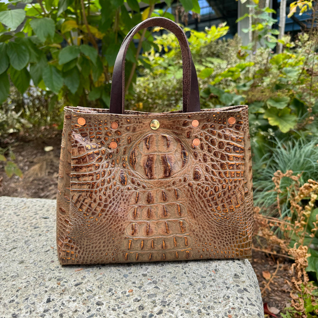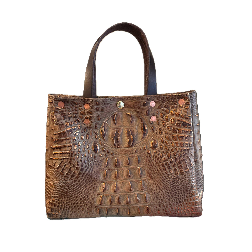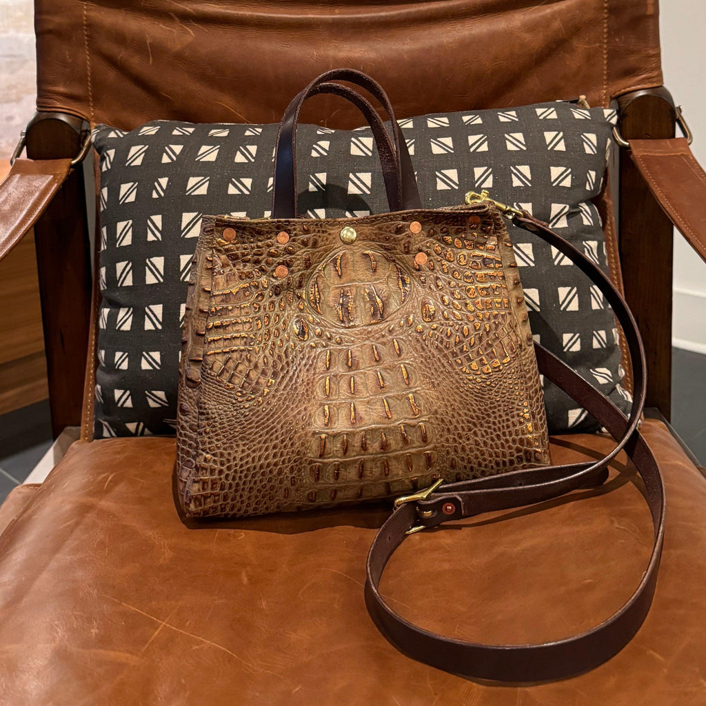 • Materials: Croc-embossed full-grain leather, vegetable-tanned leather straps, solid brass hardware, copper rivets