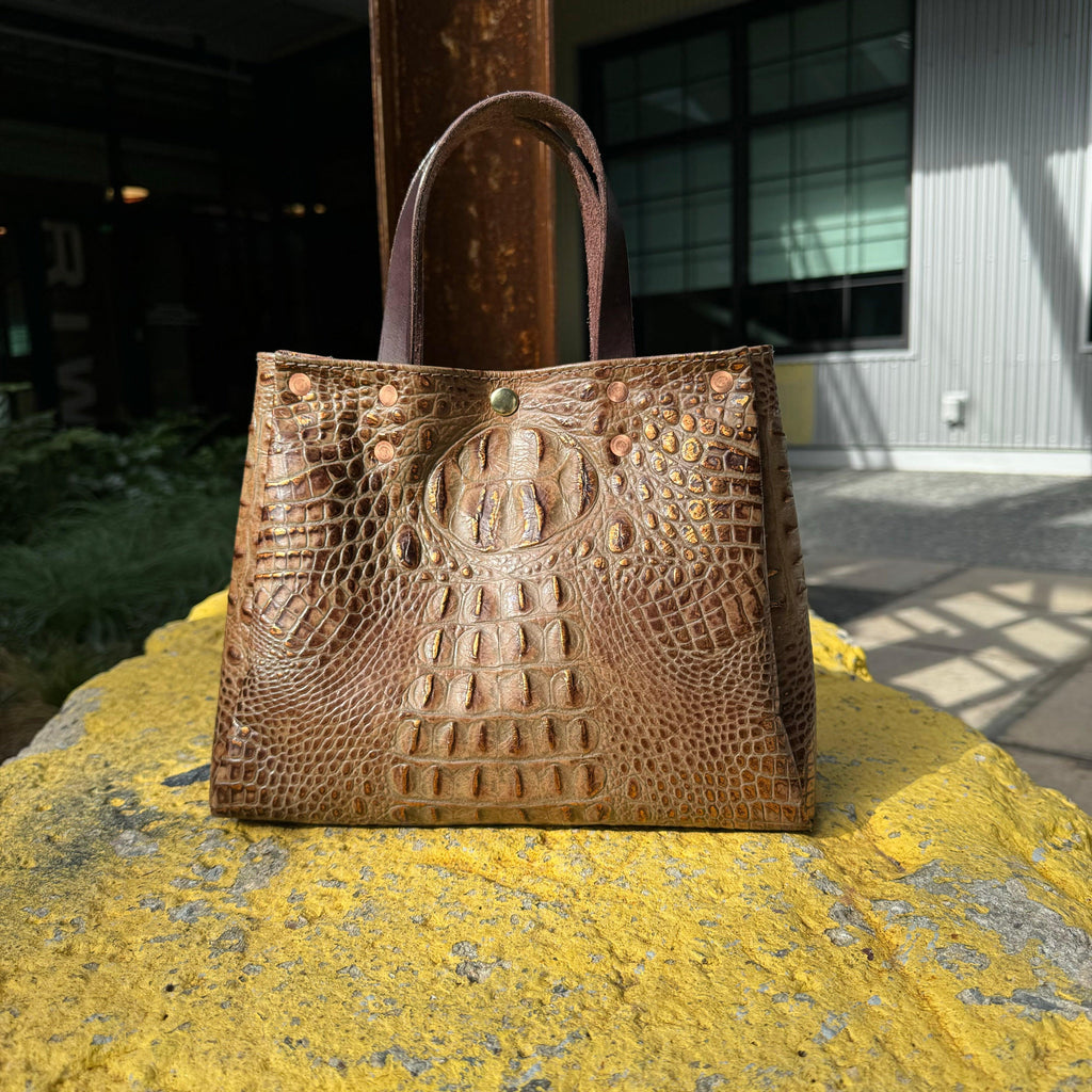Experience the epitome of elegance with The Ava—a luxury leather tote meticulously handcrafted in our North Carolina workshop. This stunning croc-embossed full-grain leather tote shines with a golden hue in the sunlight, making it a head-turning accessory for any occasion.