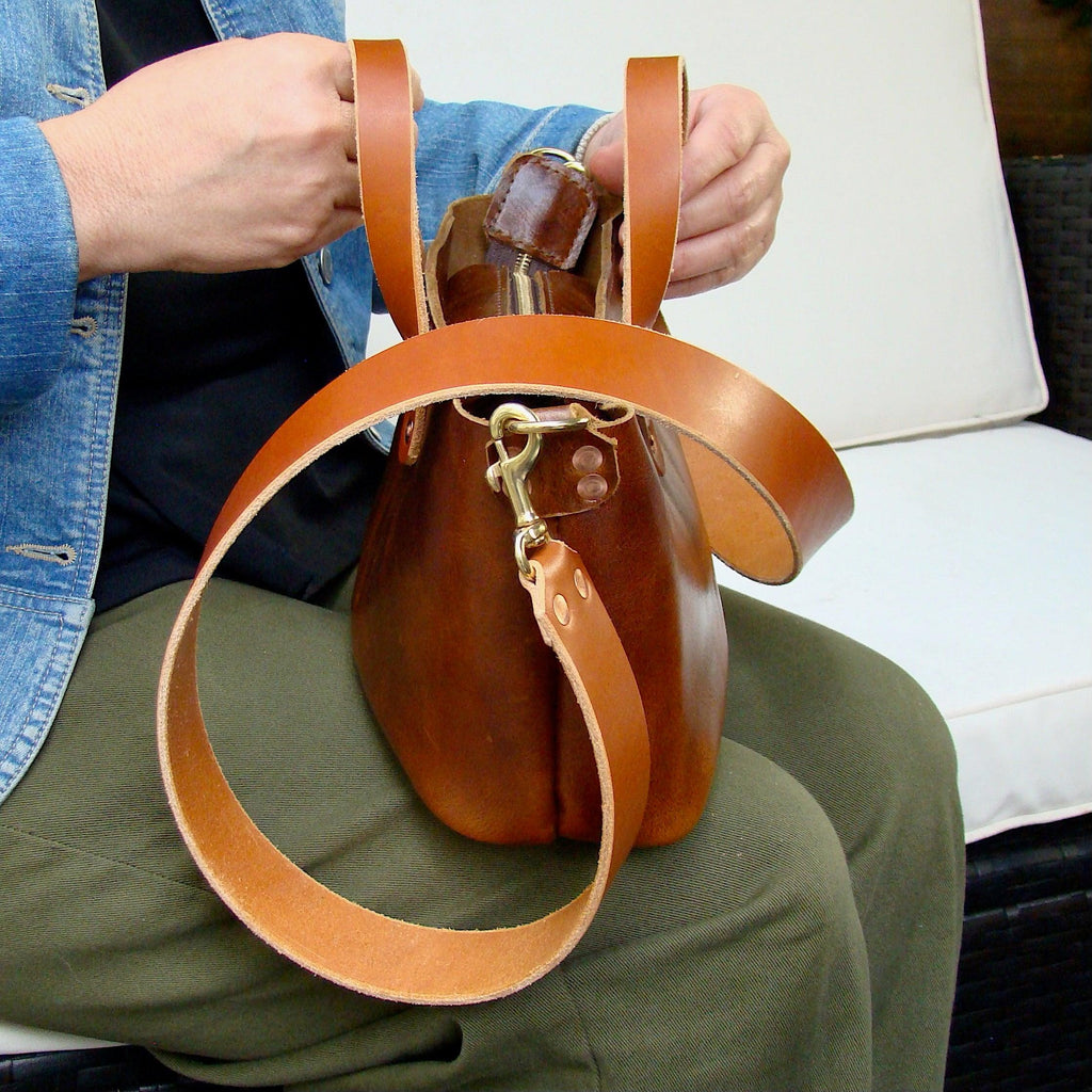 - Materials: Glazed full-grain buffalo leather, vegetable-tanned leather strap, copper rivets, brass hardware