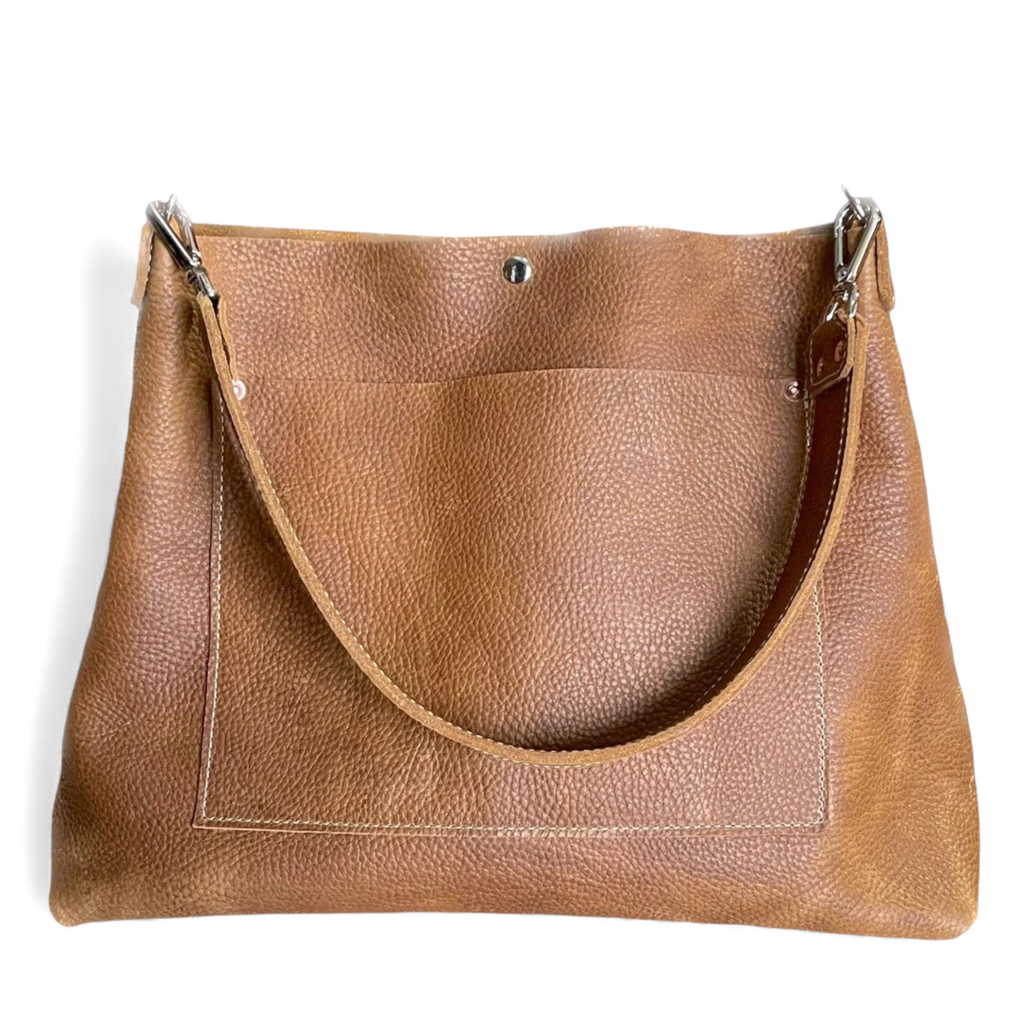 - Timeless Design: This handcrafted leather bag is made in our North Carolina workshop, ensuring each piece is unique and built to last. The oversized design and bell-shaped body give it a distinctive look that complements any outfit.